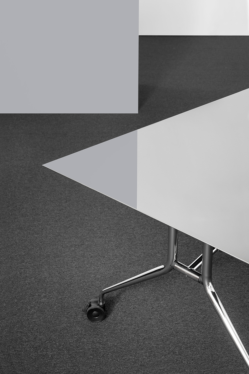 Il meccanismo di chiusura brevettato su ruote per tavoli con piani di grandi dimensioni: una soluzione concreta per ambienti flessibili e multifunzione.