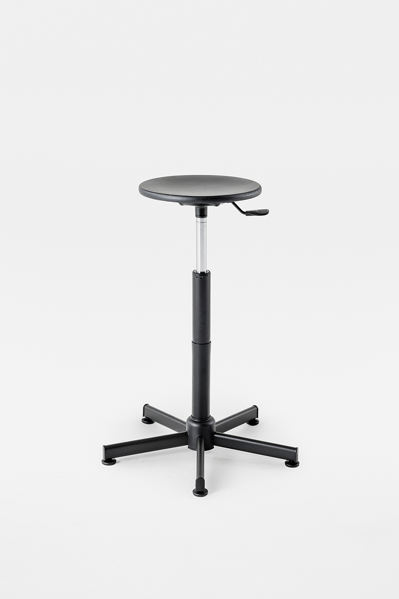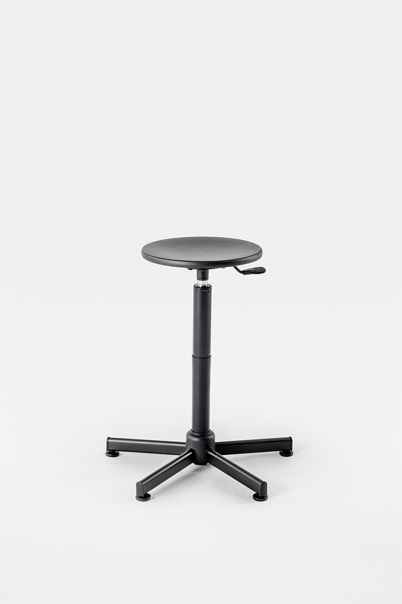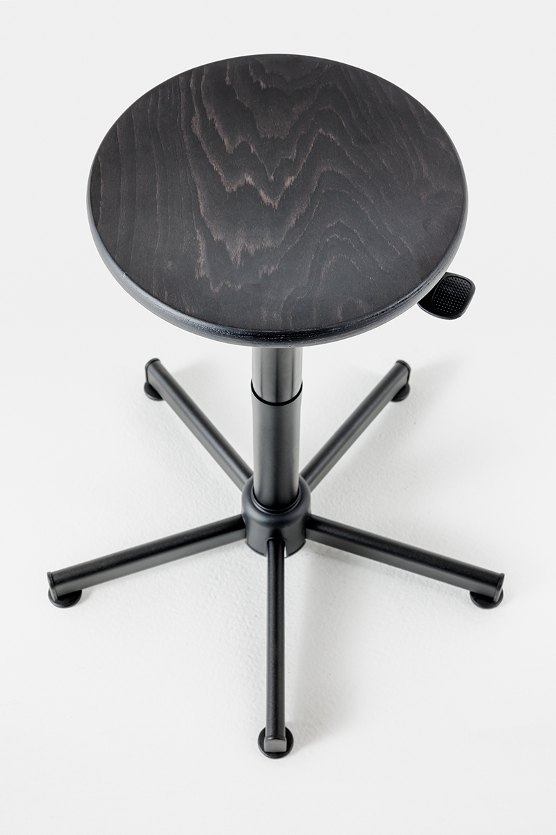 Height-adjustable gas stool with a sturdy and stable all-steel structure. Available in versions with both beechwood multilayer seat and backrest, or upholstered. The version with castors is supplied without a footrest.