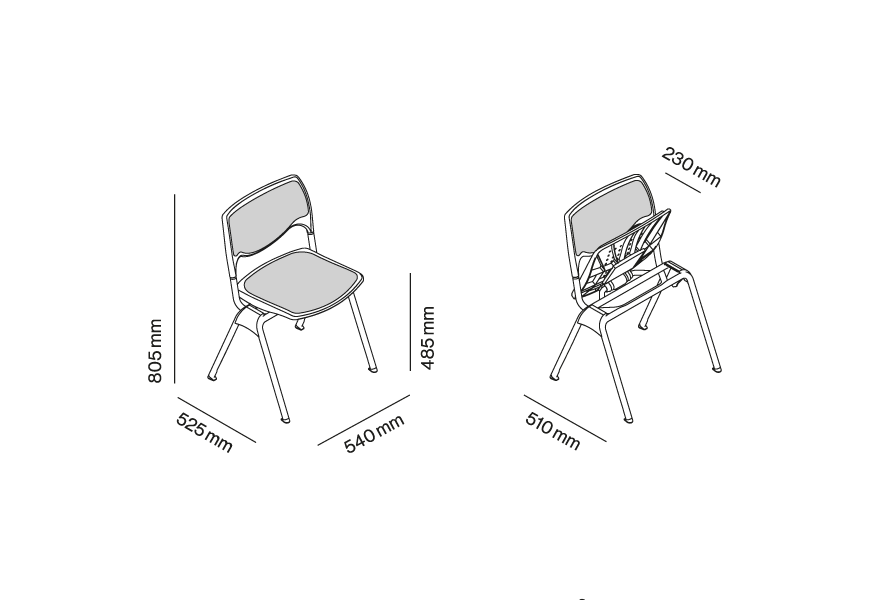Seduta e schienale in polipropilene con imbottitura, abbinati a una struttura in metallo disponibile con finitura verniciata o cromata, per adattarsi a diversi contesti progettuali.