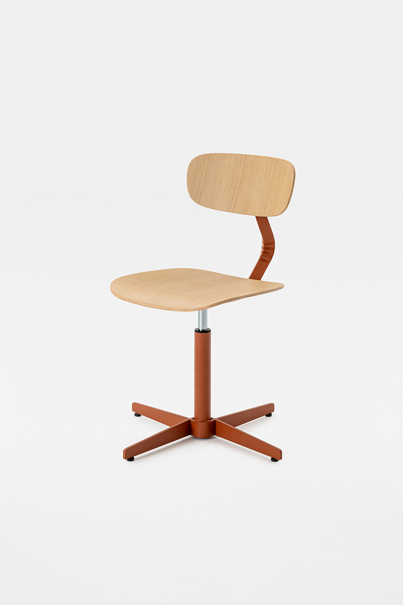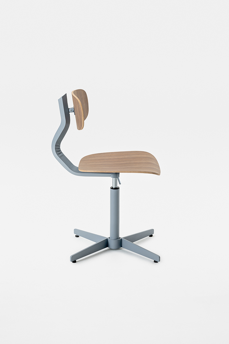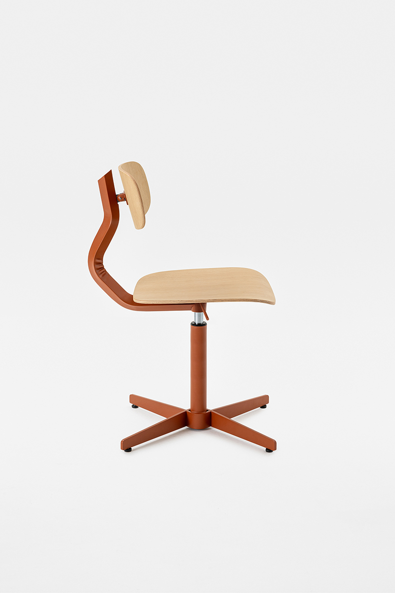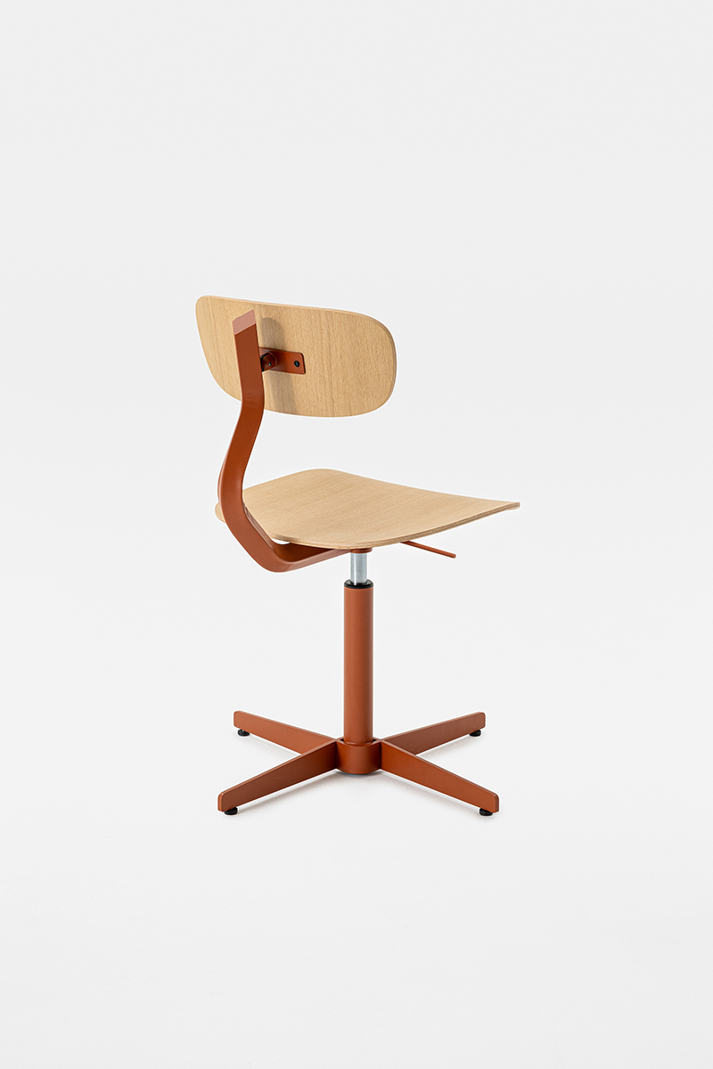 Linee morbide disegnano lo schienale e la seduta, entrambi in legno, e si contrappongono alla vigorosa spigolosità della struttura metallica, dando forma a una composizione dalla silhouette dinamica, sintesi di contrasti – non solo in termini di linee ma anche di materiali.