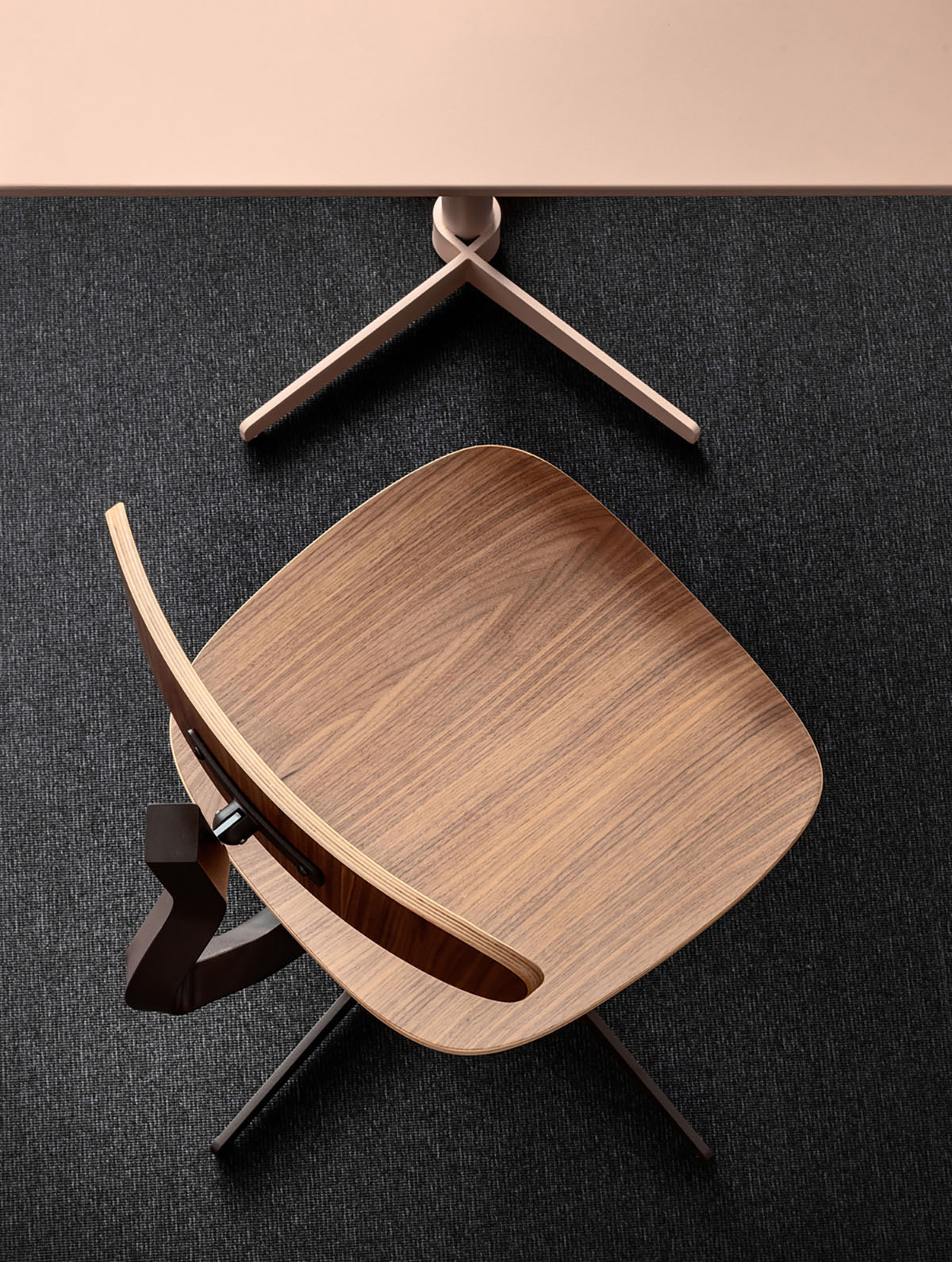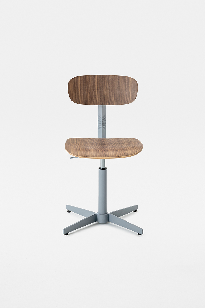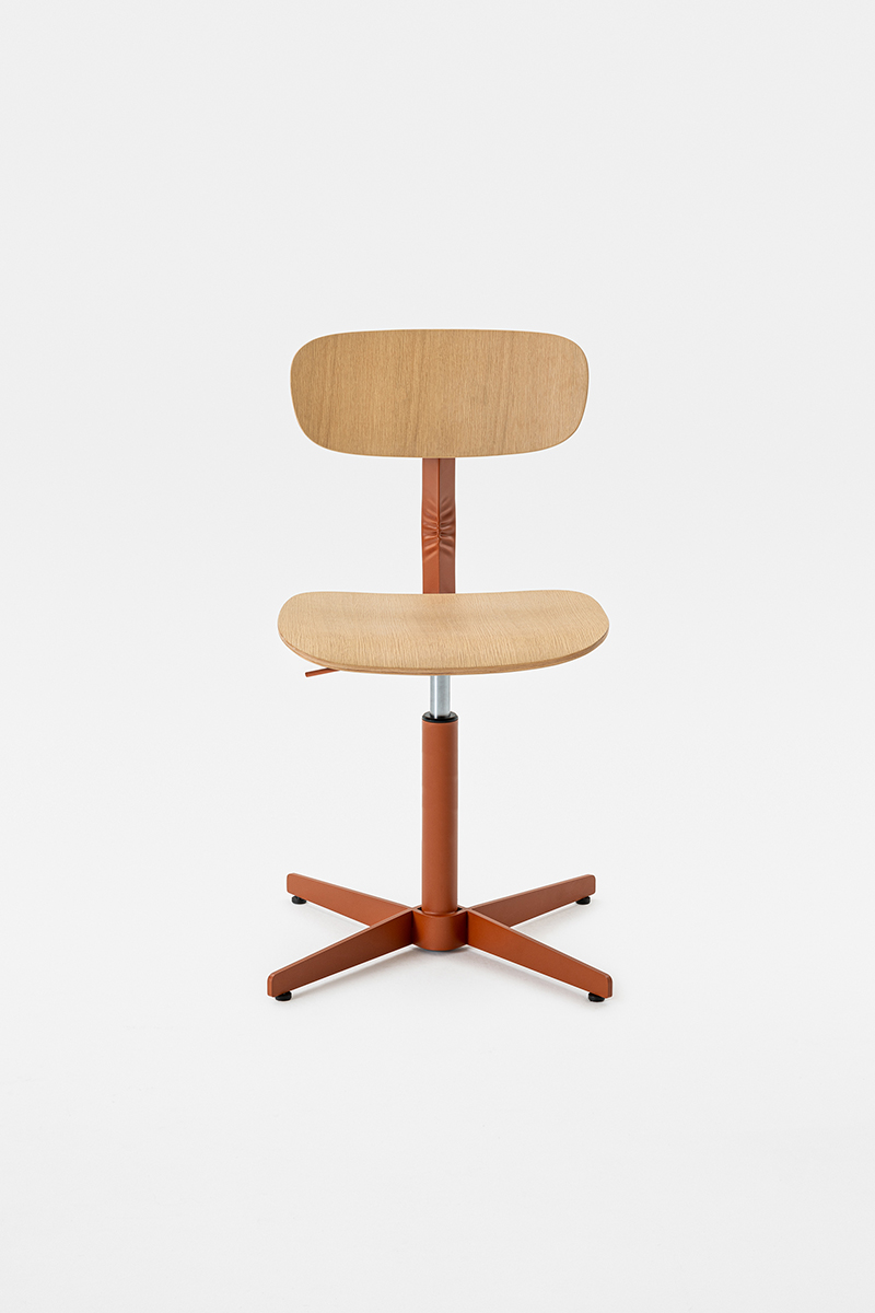 Linee morbide disegnano lo schienale e la seduta, entrambi in legno, e si contrappongono alla vigorosa spigolosità della struttura metallica, dando forma a una composizione dalla silhouette dinamica, sintesi di contrasti – non solo in termini di linee ma anche di materiali.
