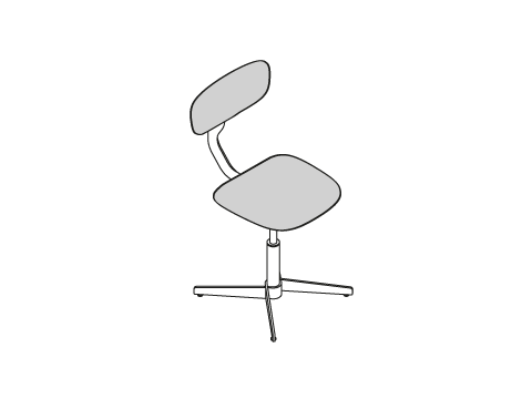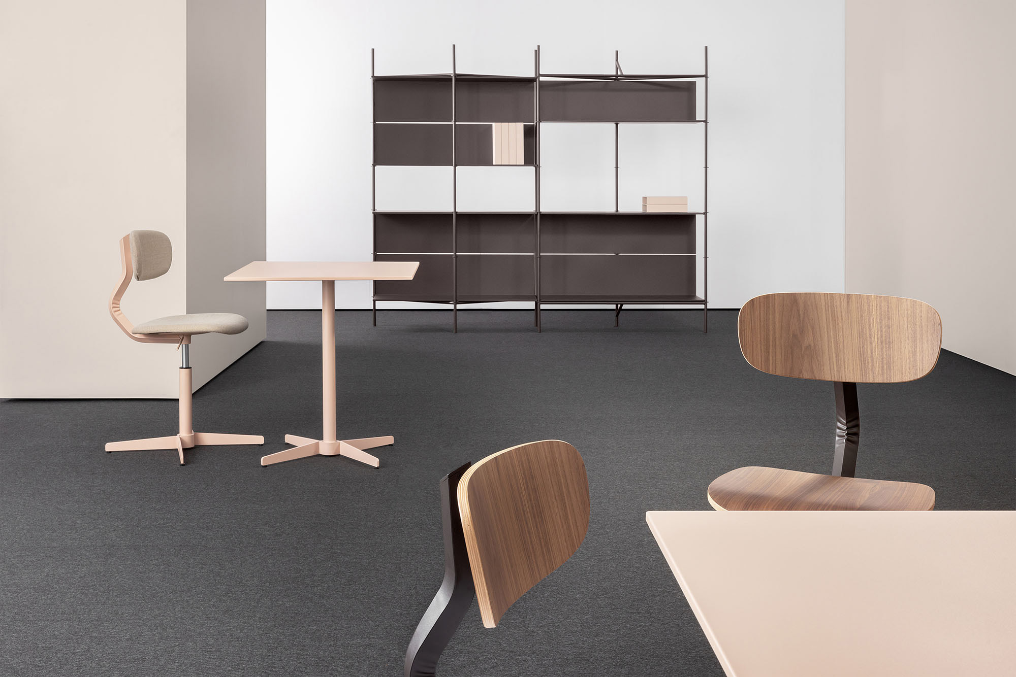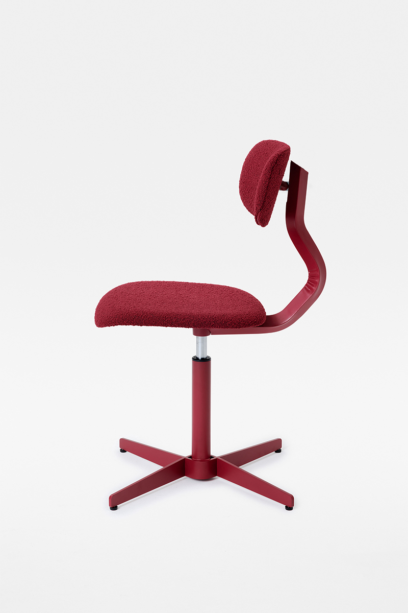 Linee morbide disegnano lo schienale e la seduta, entrambi imbottiti, e si contrappongono alla vigorosa spigolosità della struttura metallica, dando forma a una composizione dalla silhouette dinamica, sintesi di contrasti – non solo in termini di linee ma anche di materiali.