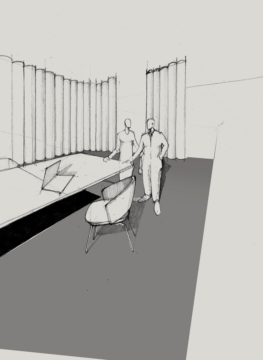 Superata questa soglia, il progetto cambia registro. L’apertura della piazza lascia spazio a un ambiente più raccolto, quasi introspettivo, dove l’architettura si fa più intima e misurata. Materiali naturali, superfici calde e tonalità materiche definiscono un paesaggio sensoriale in cui luce e colore dialogano con gli arredi: un equilibrio sottile tra spazio e oggetto in cui nessuno dei due prevale, ma entrambi concorrono a costruire un’esperienza coerente. L’allestimento accompagna il visitatore attraverso diversi scenari abitativi – dall’ufficio al workplace, dall’hospitality al residenziale – in un percorso che lavora per sottrazione e precisione.